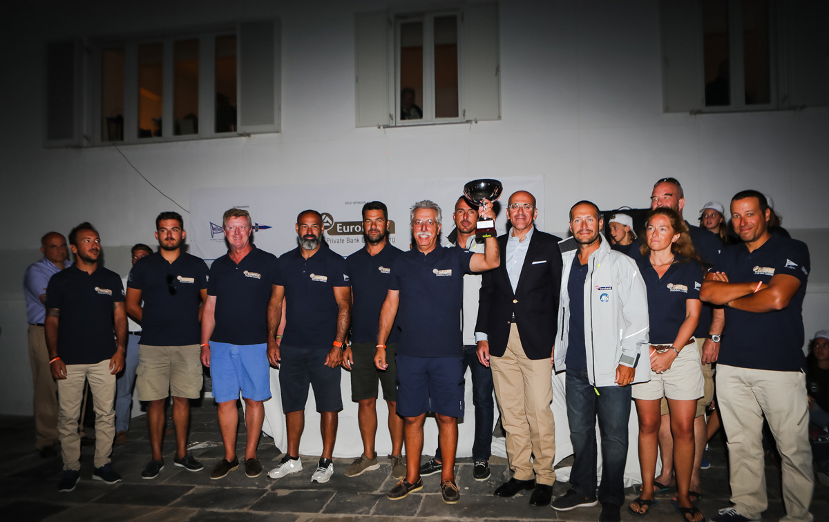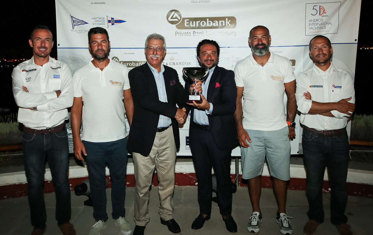 Captain & the crew of the sailboat "Black Jack" with Mr.Tsiveriotis, CEO of Spring Pass Capital Bank , Gold Sponsor of the Andros Regatta 2018, at the award ceremony of the first leg of Andros Regatta 2018 where "Black Jack" won first place - "The unknown Sailor Statue", Chora, Andros, 2018